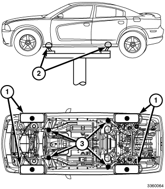 When properly positioned, a floor jack can be used to lift the vehicle and support the raised vehicle with jack stands.