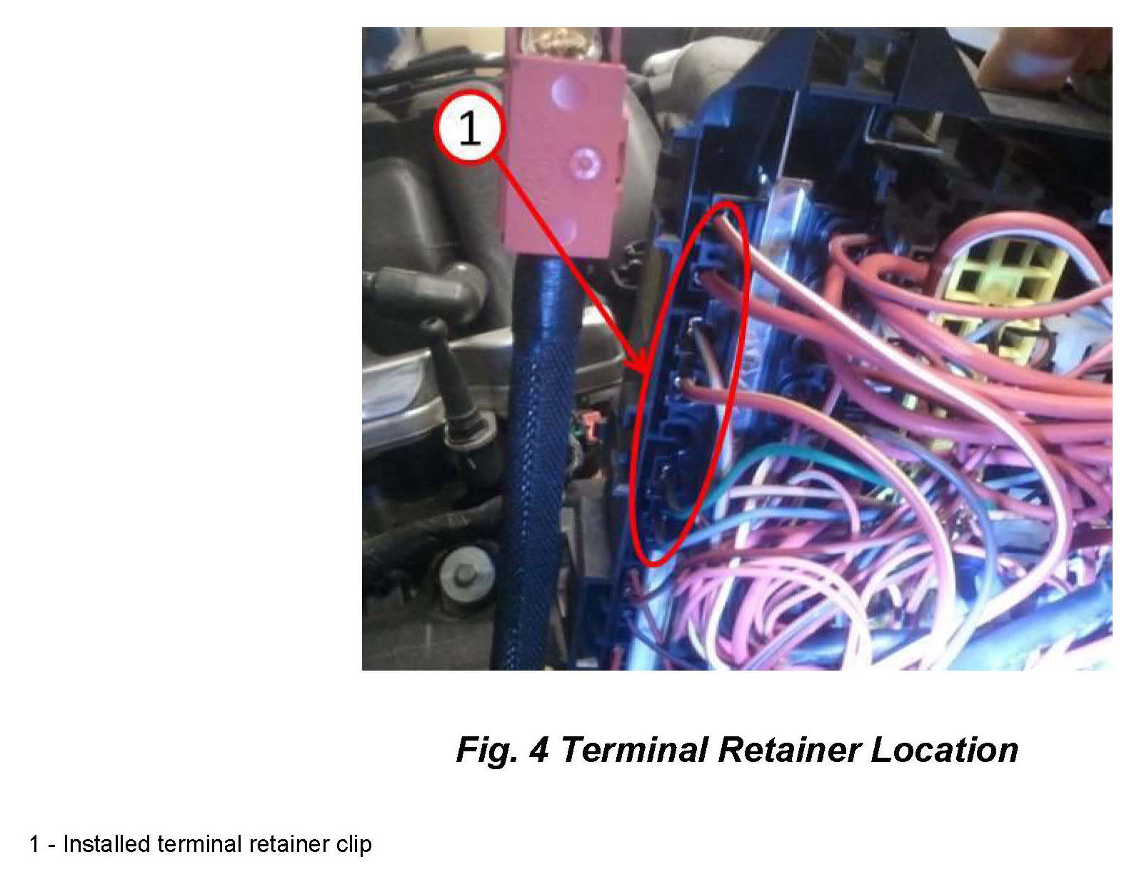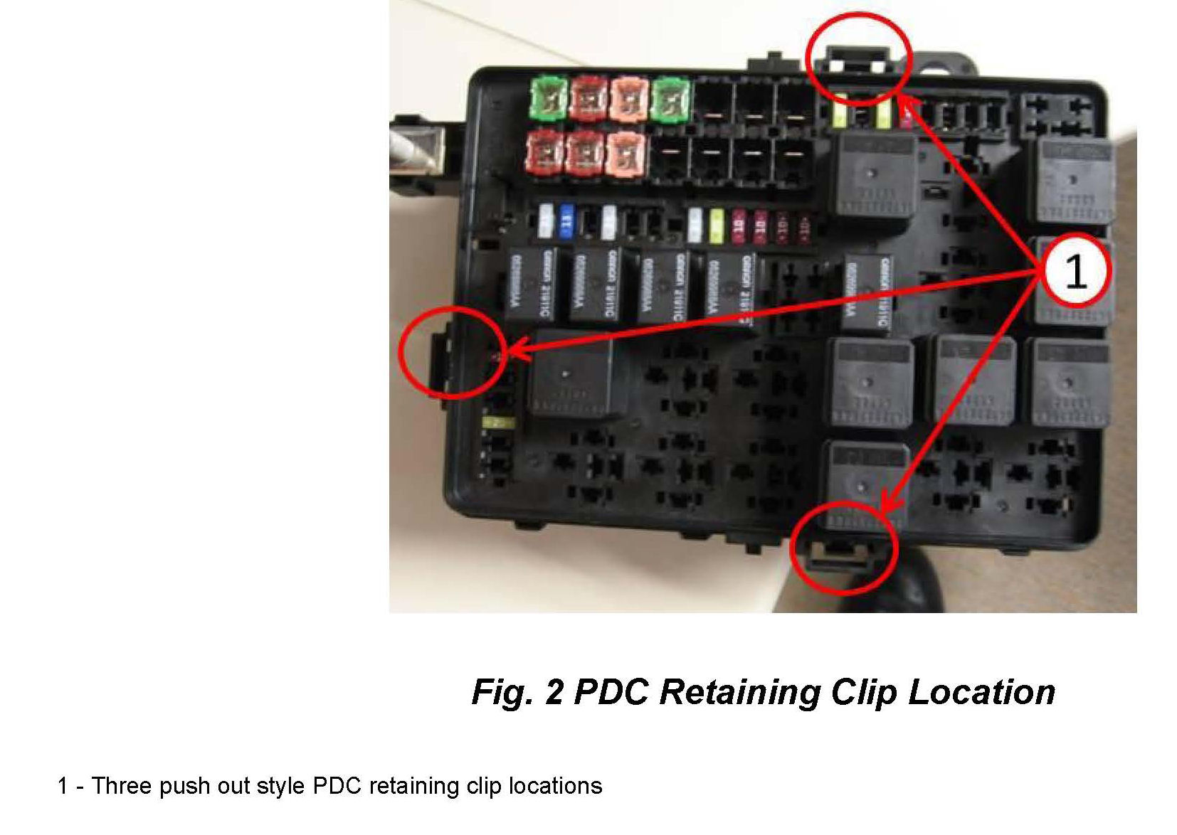 8. From bottom side of PDC, remove black rear terminal retainer (Fig 4) using a flat pick tool (Located between fuse location's 2 through 8), and discard.