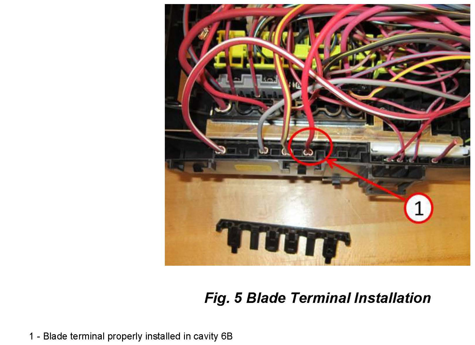 9. From service kit insert the blade terminal pig tail into cavity 6B (fuse 6) and ensure you hear the terminal click into place (Fig. 5). Pull to verify engagement.