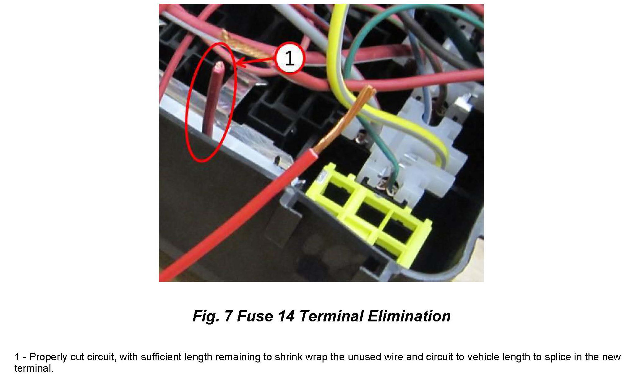 12. Approximately 35mm from the back of the terminal crimp, cut the circuit with wire cutters (Fig 7). This circuit will no longer be used.