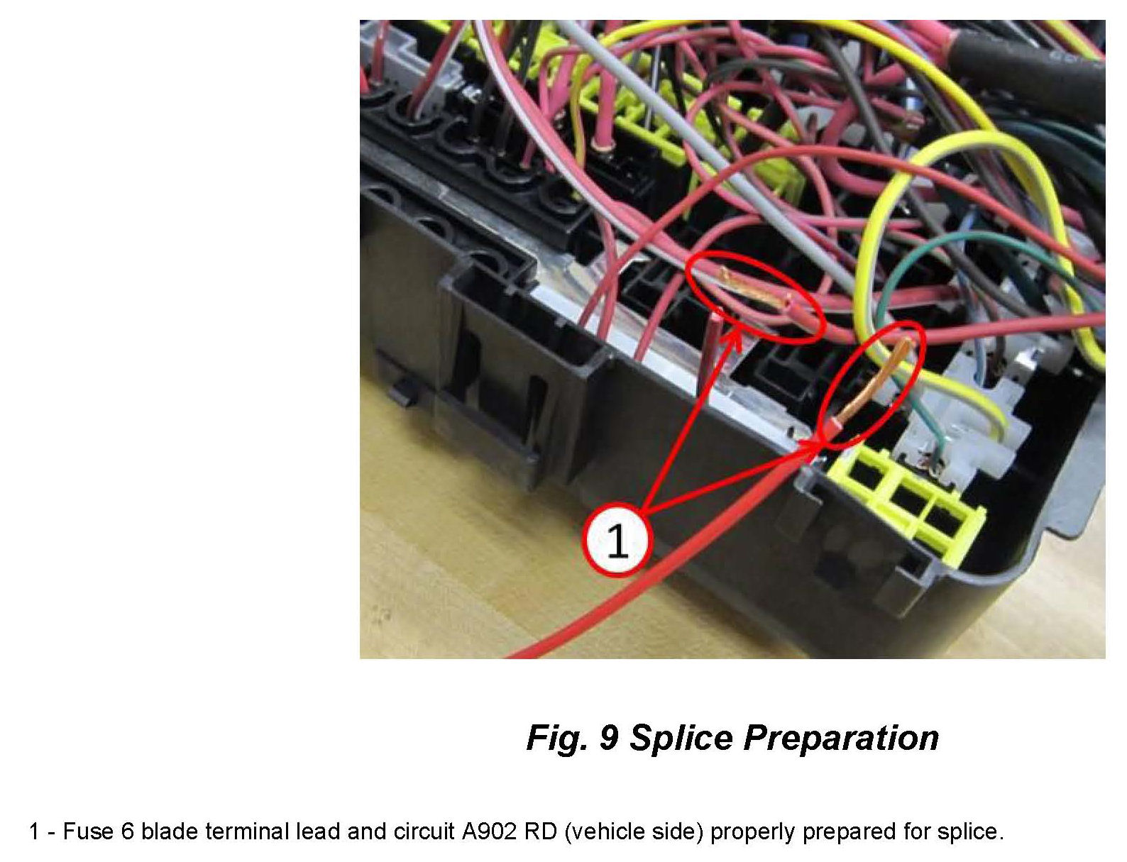 14. Prep for splice: On the remaining portion of the cut circuit, strip approximately 10-15mm of insulation using wire strippers (Fig. 9).