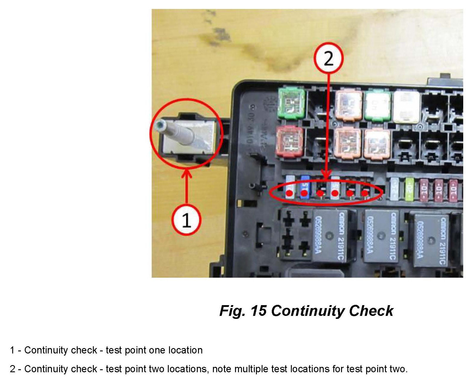 22. Connect wire harness and check for continuity, using multimeter. Place one probe on the B+ stud of the PDC. With the other probe verify continuity with cavities 28 through 33, 0 ohms for all test points (Fig. 15).