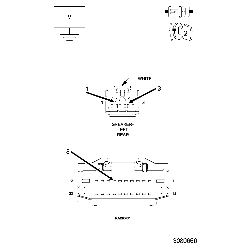 5. Measure the voltage between ground and the (X303) Left Rear Speaker (+) circuit.