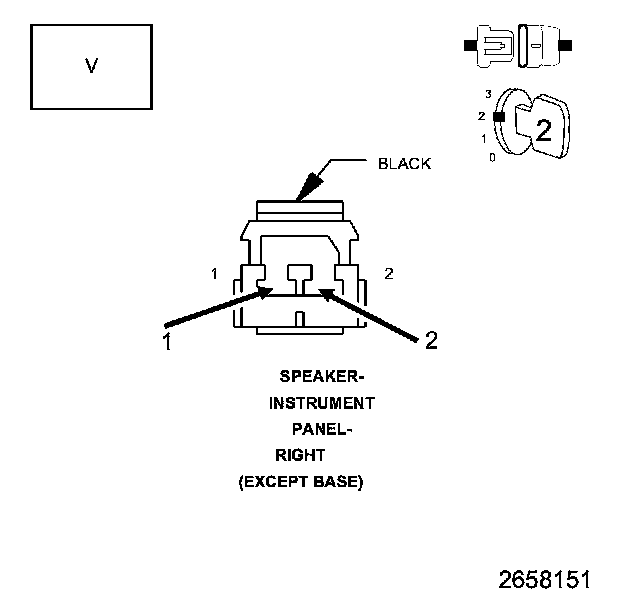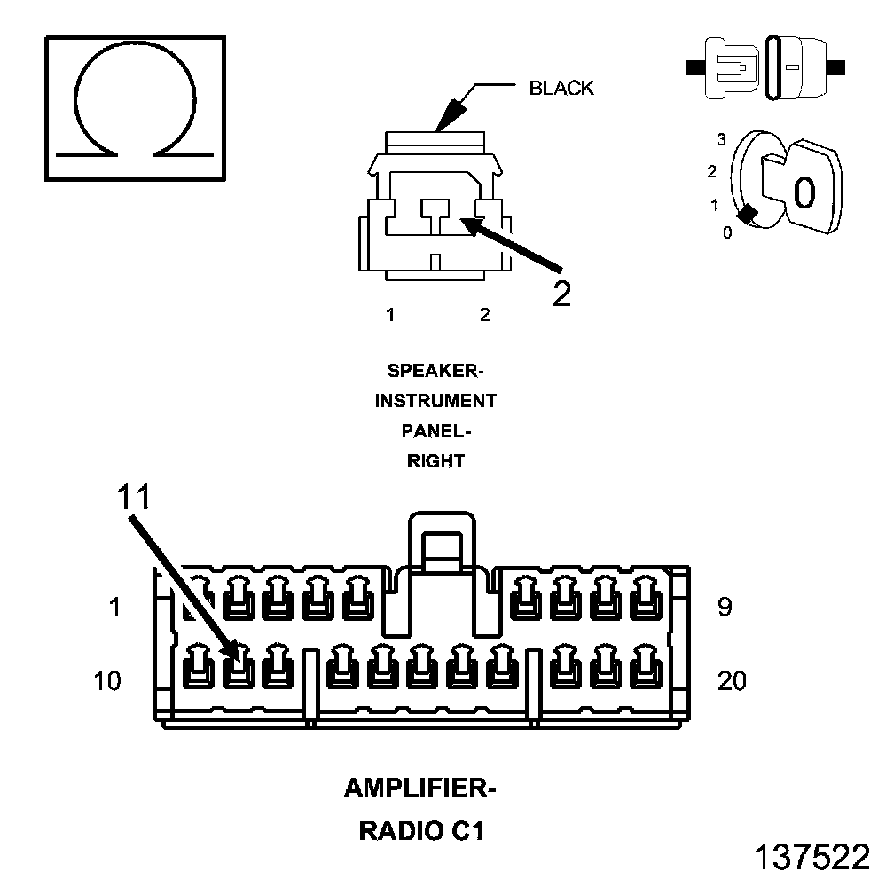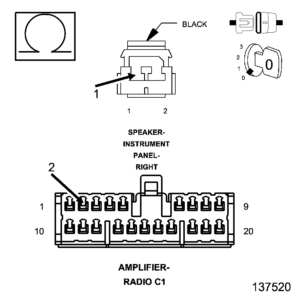 5. With a voltmeter set to read in A/C voltage, measure the voltage of the Amplified Right I/P Speaker circuits in the Right Instrument Panel Speaker harness connector.