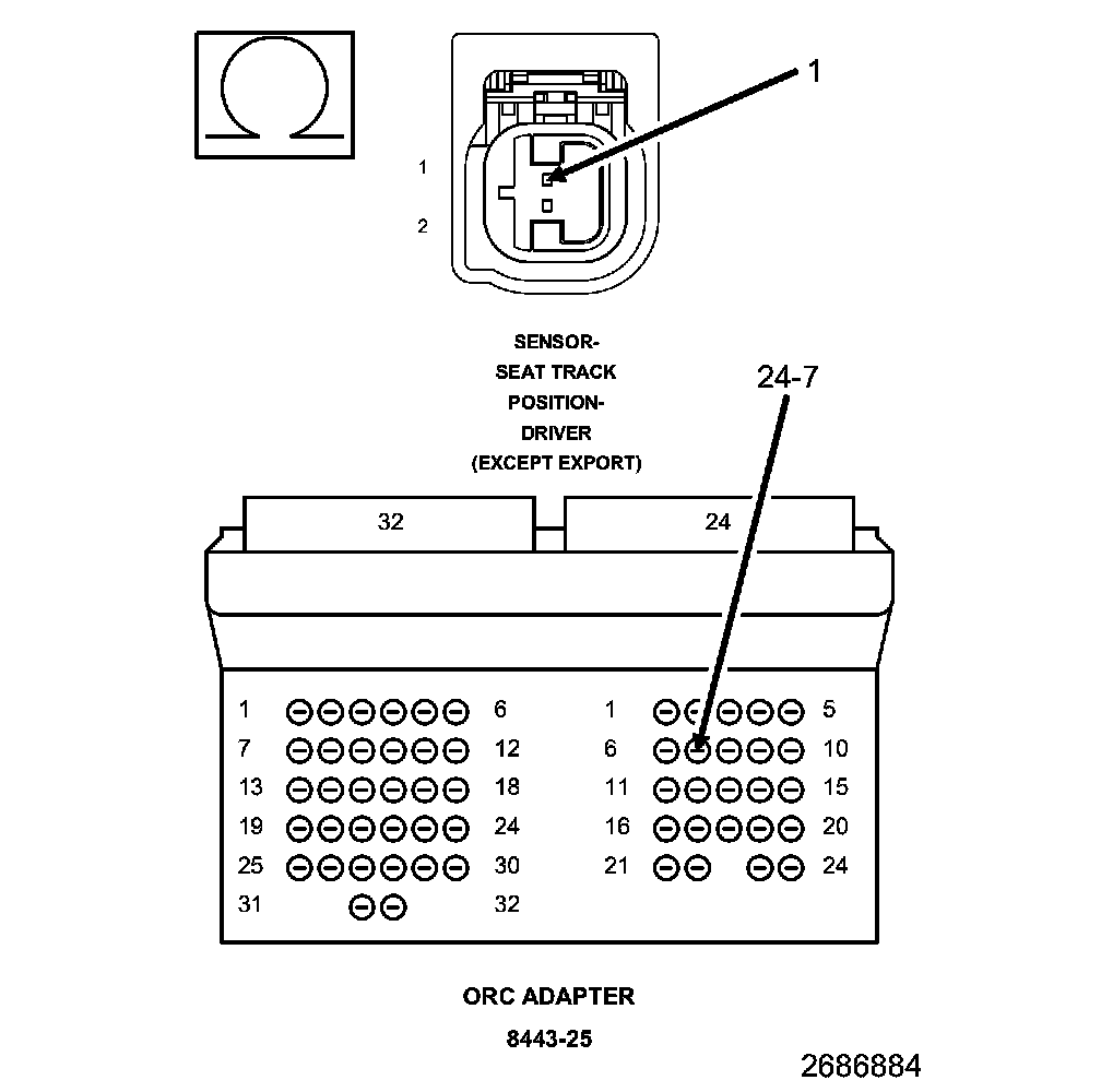 3. Measure the resistance of the (R261) Driver Seat Position Sensor Data circuit between the SRS Load Tool Adaptor (8443-25) cavity 24-7 and the Driver Seat Track Position Sensor connector cavity 1.