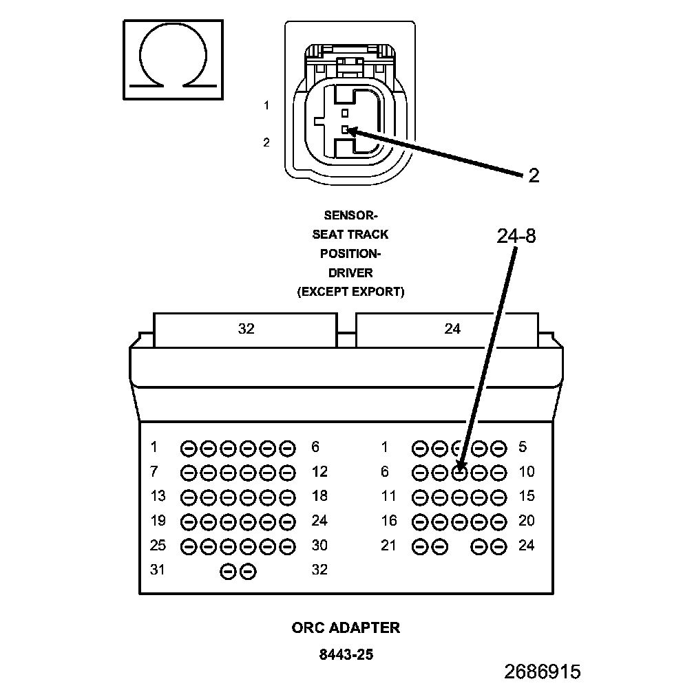 4. Measure the resistance of the (R263) Driver Seat Position Sensor Voltage circuit between the SRS Load Tool Adaptor (8443-25) cavity 24-8 and the Driver Seat Track Position Sensor connector cavity 2.