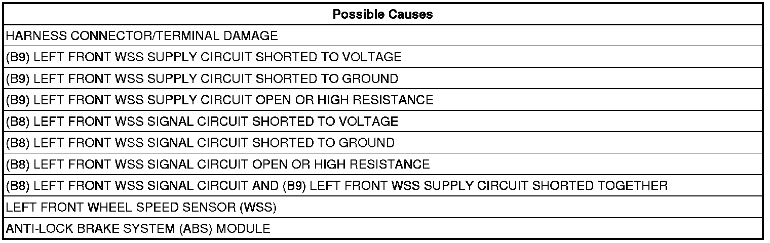 - Repair the (B8) Left Front WSS Signal circuit for a short to voltage.