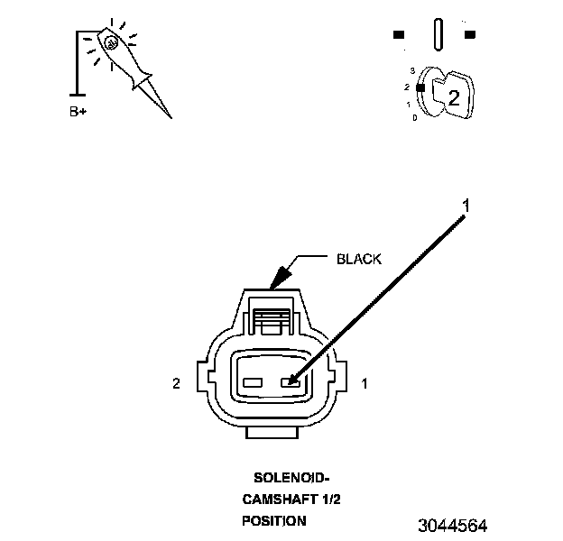 4. Using a 12-volt test light connected to B (+), check the Ground circuit in the Camshaft 1/2 Position Solenoid/Oil Control Valve harness connector.