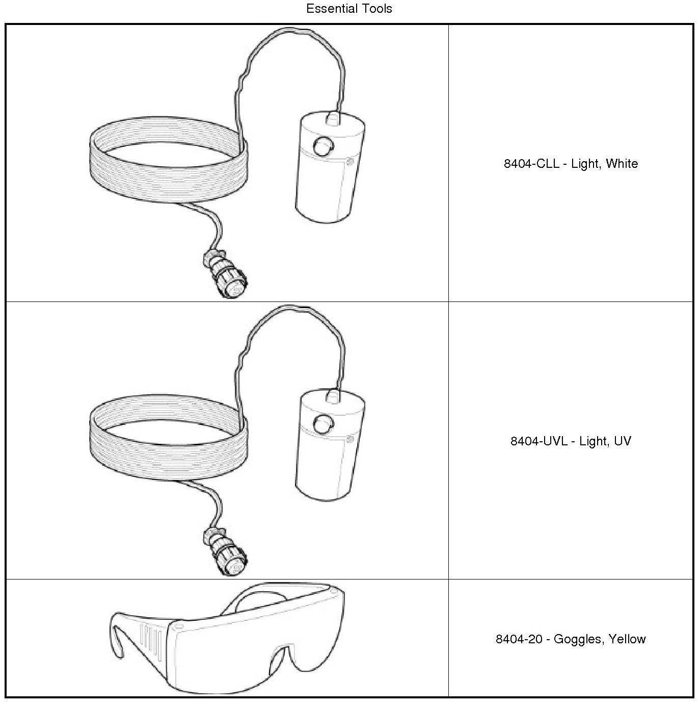 8. If a leak is concealed from view, release the remote smoke/air start button and use the ultraviolet (UV) black light (8404-UVL) and the yellow goggles (8404-20) to look for residual traces of dye that is left behind by the smoke.