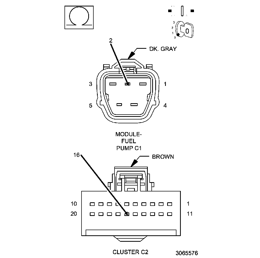1. Using the wiring diagram/schematic as a guide, inspect the wiring and connectors between the Fuel Level Sensor and the Instrument Cluster (CCN).