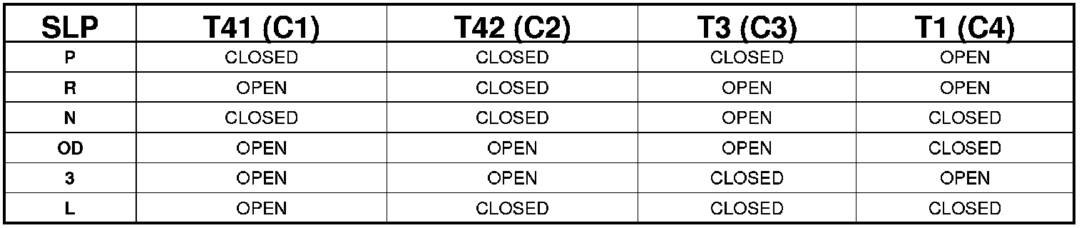 The C1 through C4 (T41, T42, T3, and T1) signal circuits communicate the shift lever position to the Powertrain Control Module (PCM). Each circuit is terminated at the transmission with a switch. Each switch can be either open or closed, depending on the shift lever position. The PCM can decode this information and determine the shift lever position. Each shift lever position has a certain combination of switch positions (open or closed), this is called a PRNDL code. There are four switches, therefore: there are many possible combinations of open and closed switches (codes). However, there are only nine valid codes (eight for AutoStick), one for each gear position and three recognized between gear (transition) codes. Any other switch combinations should never occur, these are called invalid codes. The following chart shows the normal switch states for each shift lever position.