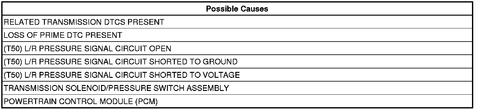 The DTC is set if the L/R pressure switch is open or closed at the wrong time in a given gear. If the problem is identified for three successive key starts, the transmission will go into Limp-in mode and the MIL will turn on after 10 seconds of vehicle operation.