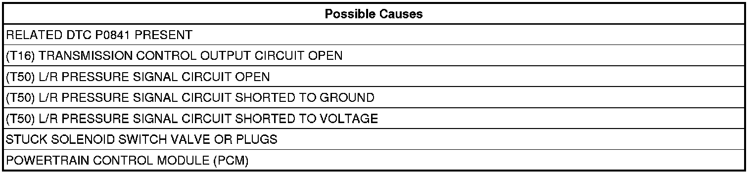The Solenoid Switch Valve, an internal, hydraulically operated valve, controls the direction of the transmission fluid when the L/R solenoid is energized. When the solenoid switch valve is in the downshifted position and the L/R solenoid is energized, fluid is directed to the L/R element for 1st gear. When the solenoid switch valve is In the up-shifted position (2nd, 3rd, and 4th gear) and the L/R solenoid is energized, fluid is directed into the Lockup Switch Valve which controls the Torque Converter Clutch. When shifting into 1st gear, a special sequence is followed to insure solenoid switch valve movement into the downshifted position. The L/R pressure switch is monitored to confirm switch valve movement. If the solenoid switch valve movement is not confirmed (i.e. no L/R pressure switch response when the L/R solenoid is energized), 2nd gear is substituted for 1st. No 1st gear (2nd gear is substituted). The transmission Torque converter FEMCC operation is inhibited. MIL on after 5 min. of substituted operation.