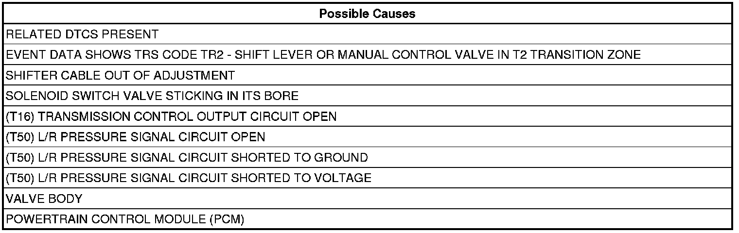 - This indicates the shift lever and the manual control valve were in the T2 transition zone between Neutral and OD. Check the shifter cable for: proper adjustment, binding, friction, improper routing, or the shifter was moved in transit. Repair as necessary.