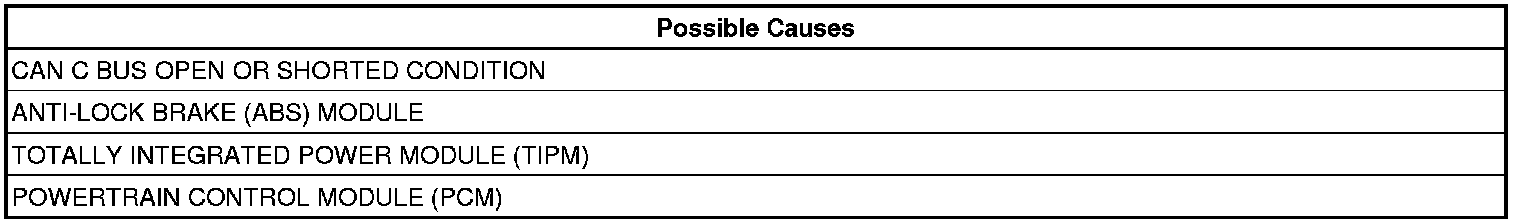 The Powertrain Control Module (PCM) doesn't receive an ABS message over the CAN C circuit for seven consecutive seconds. The circuit is continuously monitored.