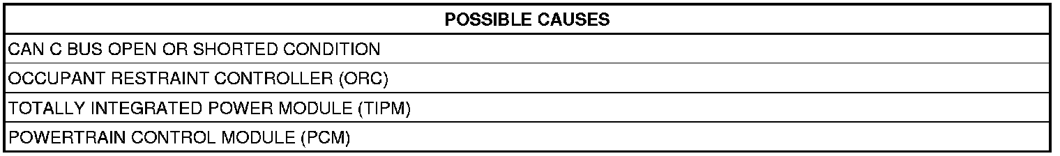 The Powertrain Control Module (PCM) doesn't receive an Occupant Restraint Controller (ORC) message over the CAN C circuit for seven consecutive seconds. The circuit is continuously monitored.
