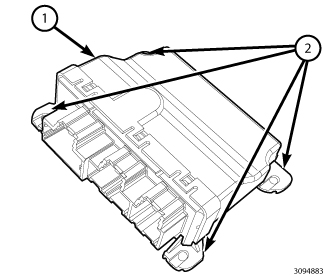 This vehicle is equipped with two electronic front door control modules (1) (also known as a Driver Door Module/DDM, a Passenger Door Module/PDM or Front Door Multiplex/MUX Modules), one each on both the driver and passenger front doors. Each door control module is concealed behind the front door trim panel where it is secured through four integral mounting tabs (2) to the door hardware module carrier by four screws.