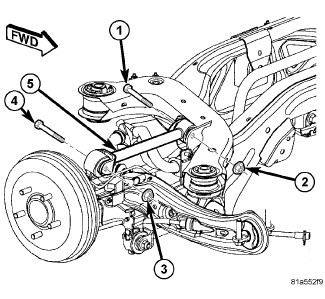 1. Position the upper control arm (5) and install the bolt (1) and nut (2) securing the arm to the crossmember. Do not tighten at this time.