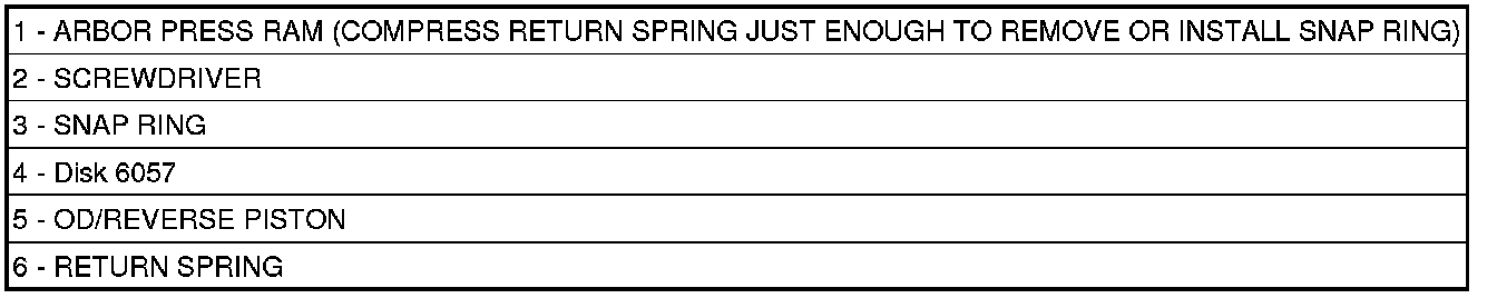 4. Using an arbor press (1) and Disk (6057) (4), install OD/Reverse piston (5), return spring (6), and snap ring (3).