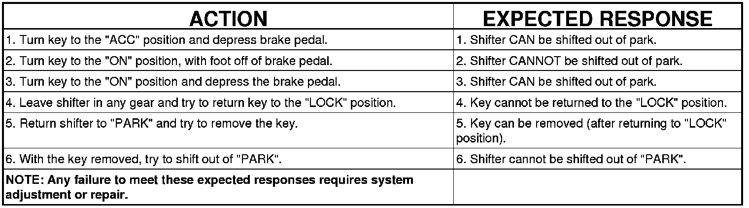 The following chart describes the normal operation of the Brake Transmission Shift Interlock (BTSI) system. If the "expected response" differs from the vehicle's response, then system repair and/or adjustment is necessary.