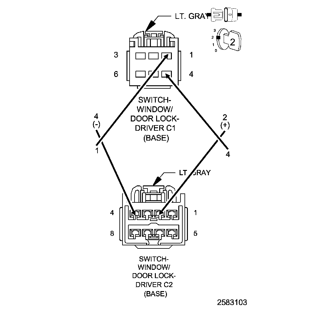 3. Connect a Jumper wire between the Ignition Switch Output circuit (C2 connector - Cavity 2) and the Master Window Switch Left Rear (Down) circuit (C1 connector - Cavity 4).