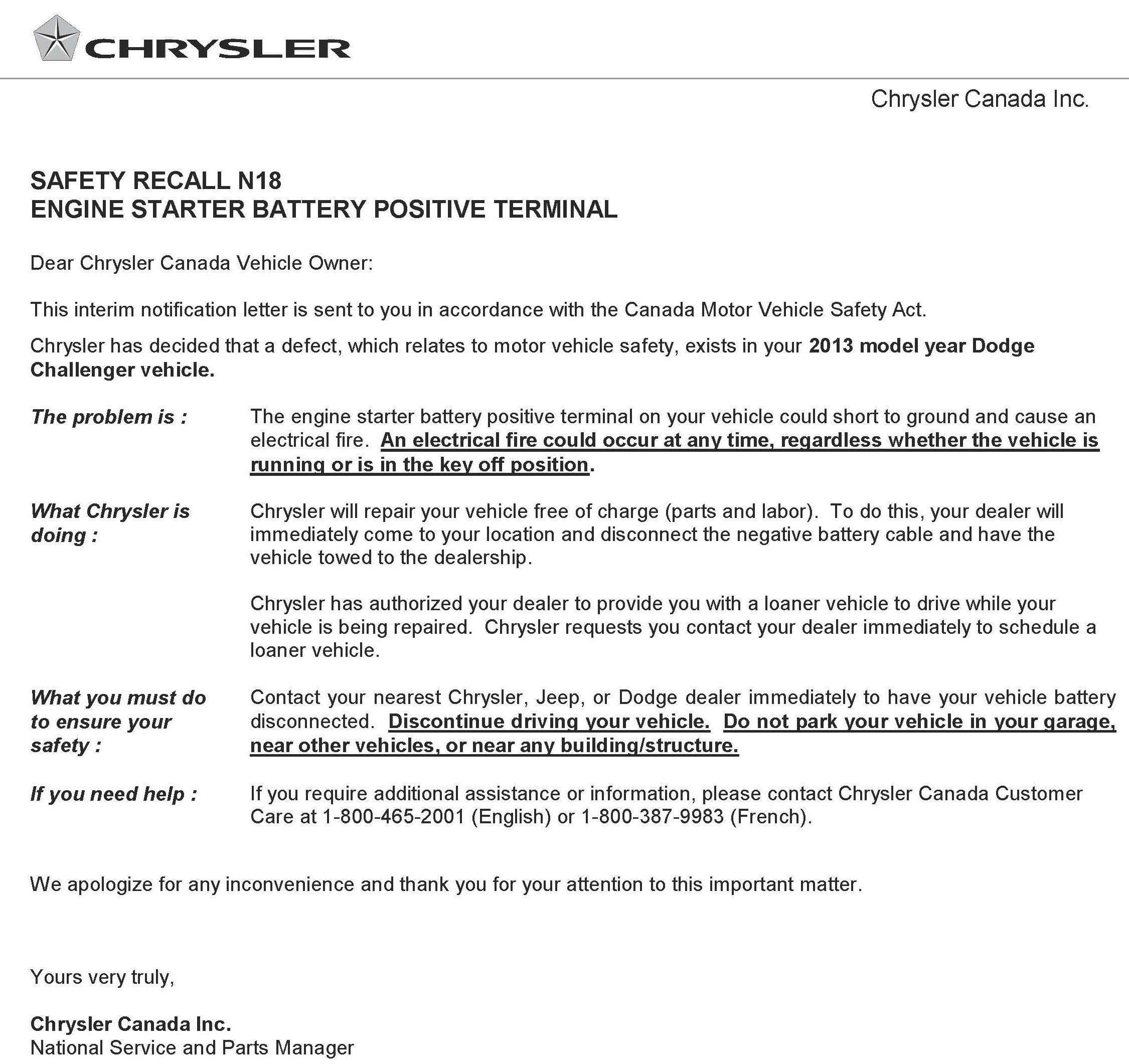 Canada - Recall - Engine Starter Positive Battery Terminal