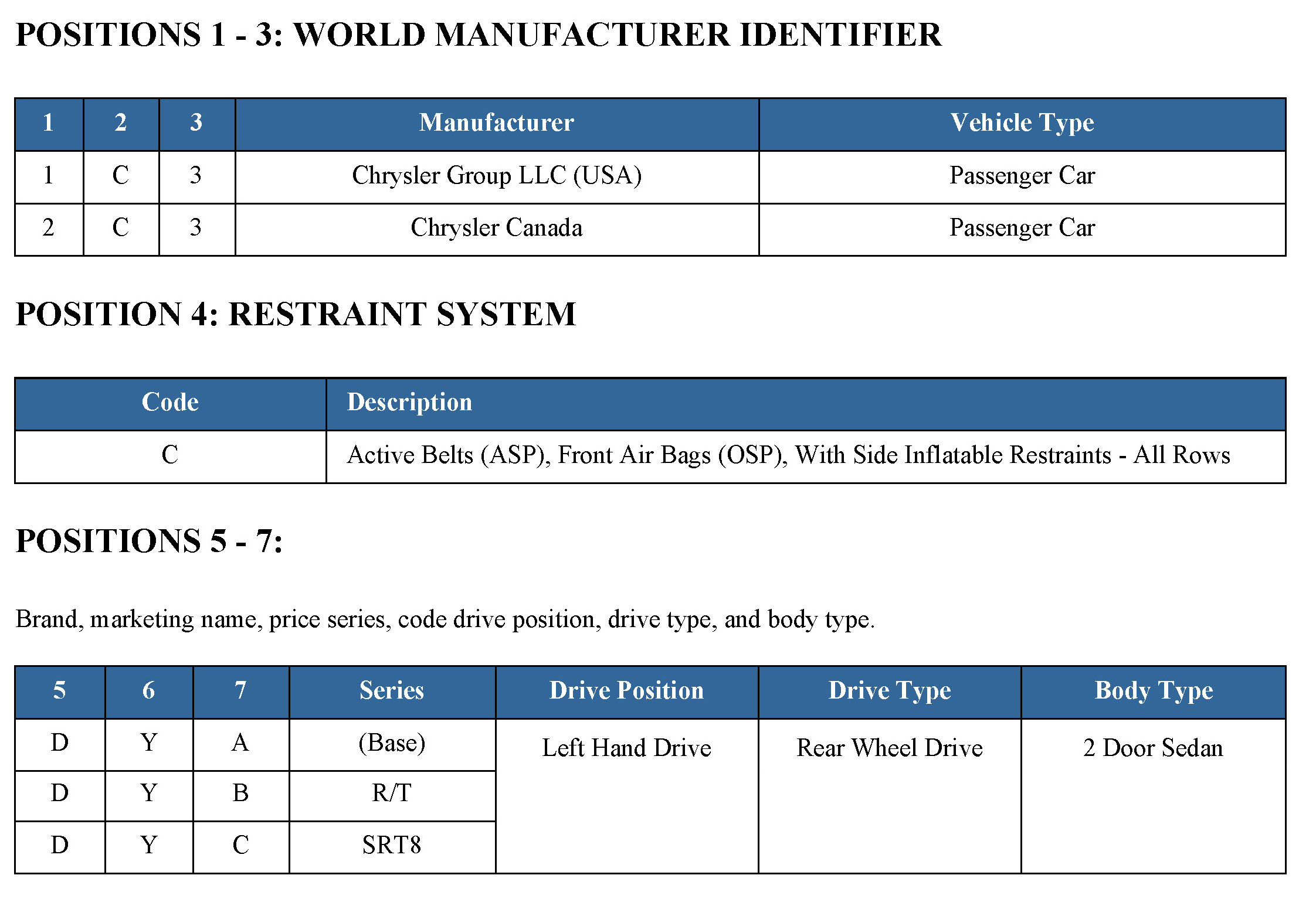 The Vehicle Identification Number (VIN) plate is attached to the top left side of the instrument panel. The VIN contains 17 characters that provide data concerning the vehicle. Refer to the decoding chart to determine the identification of a vehicle.