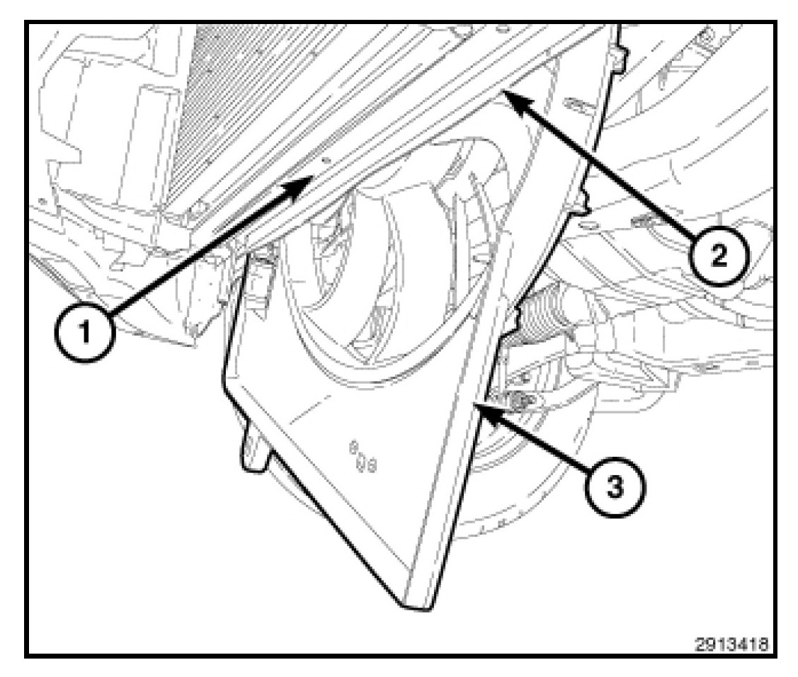 NOTE: To aid in removal. The upper shroud cover must be removed before the radiator. Leaving the cover on may cause the radiator to become jammed against the upper core support.