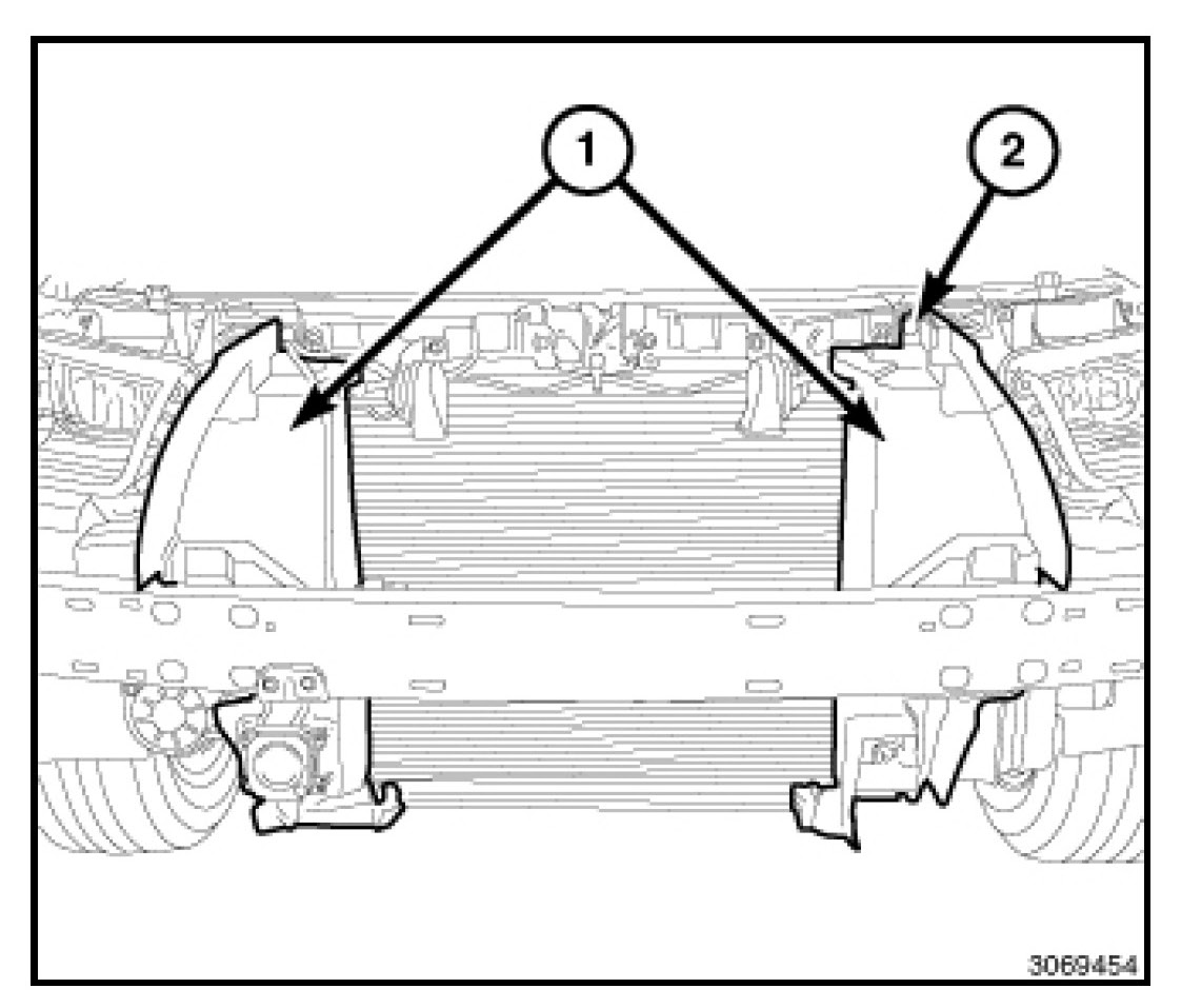 13. Remove the upper radiator brackets (1) from the radiator supports (2).