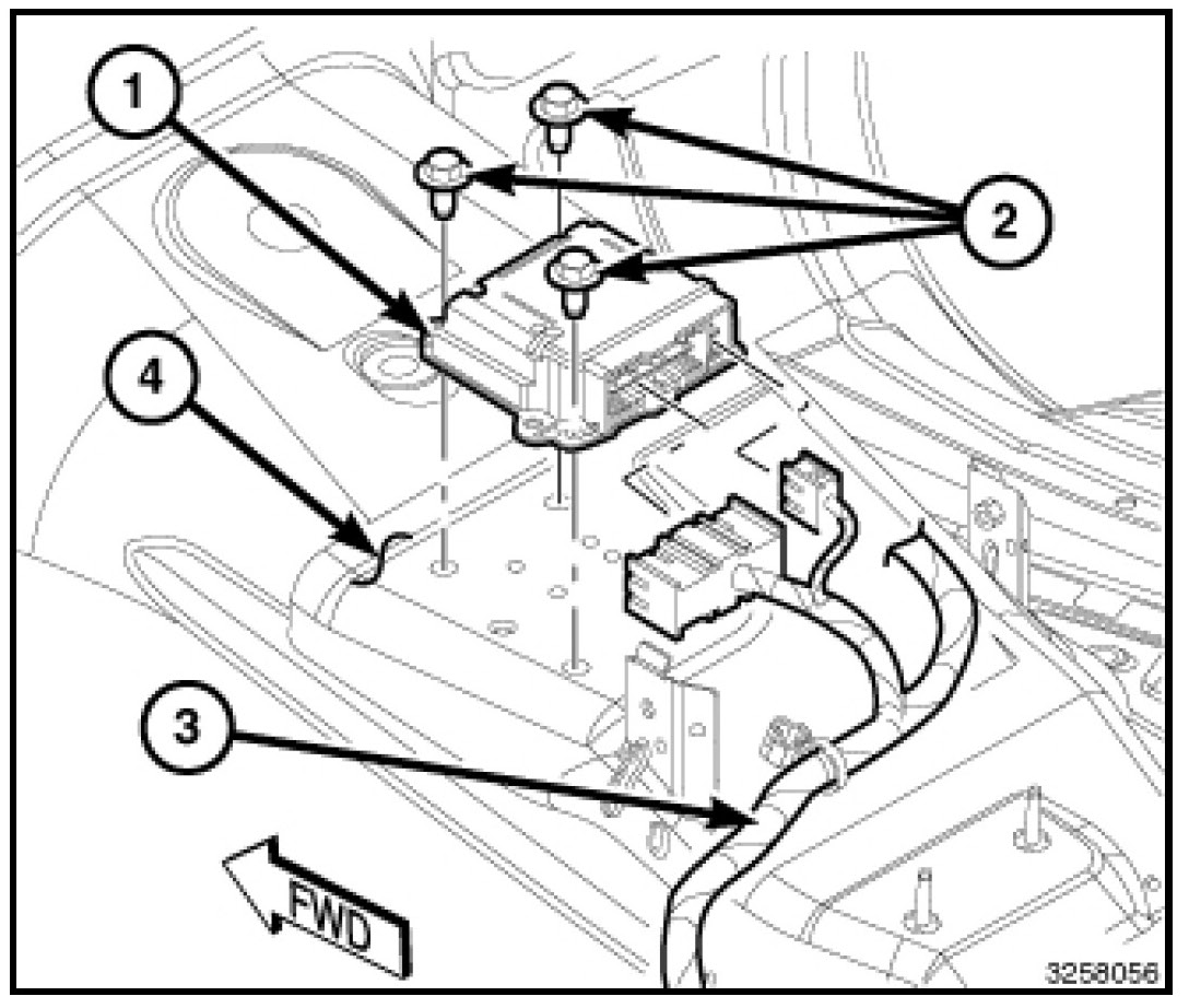 1. Carefully position the Occupant Restraint Controller (ORC) (1) onto the floor panel transmission tunnel (4). When the ORC is correctly positioned, the orientation arrow on the ORC label will be pointed forward in the vehicle.
