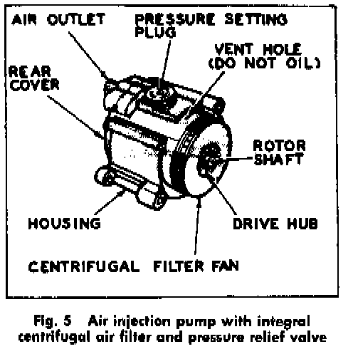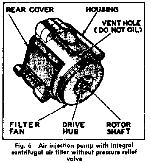 The air pump is a positive displacement unit that requires no maintenance, Fig. 5 and 6. The early units incorporated a replaceable element type air filter and pressure relief valve. Later units incorporate only a replaceable centrifugal type air filter. The pressure relief valve on early units is located in the exhaust cavity and encloses a preloaded spring, a seat and pressure setting lug.
