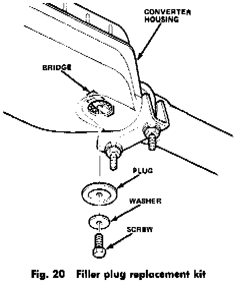 10. On early model converters with threaded plug, coat plug threads with an anti-seize compound, then install plug and torque to 40 ft. lbs. On later models with non-threaded plug, Fig. 20, proceed as follows: