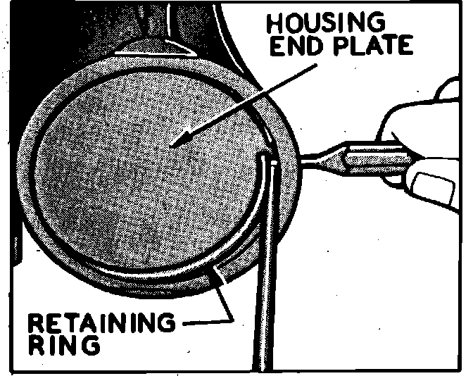 2. Rotate gear housing end plug retaining ring so that one end of ring is over hole in housing. Spring one end of ring with a punch to allow screwdriver to be inserted to lift ring out.