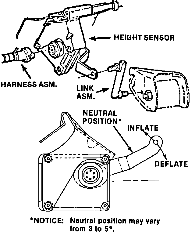 6. Move arm about 1 1/2 inches above the neutral position. There should be a 7 - 15 second delay before compressor turns on and shock absorbers start to inflate. As soon as shock absorber air springs noticeably fill, stop compressor by moving sensor arm down. Note arm position when compressor stops.