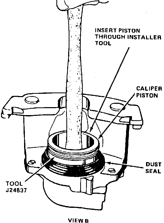 5. Lubricate caliper piston and insert through tool. Center piston in bore and use a hammer handle to apply pressure to install piston halfway into bore,. On some models, disc brake caliper pistons may develop a light coating of rust under the dust seal and outboard of the piston seal. This rust may cause the piston to not fully retract. Before installing piston, apply a light coating of dielectric compound 8126688, or equivalent, to caliper piston bore.