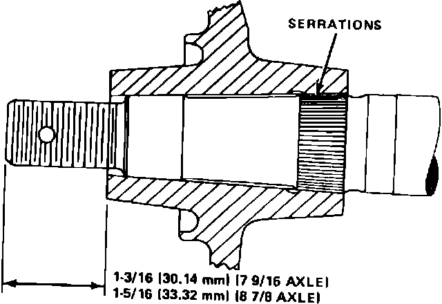 Do not use an original hub on a replacement axle shaft; use a new hub. A new hub may be installed on an original axle shaft providing the serrations on the shaft are not worn or damaged. Be certain that the hub and axle shaft are punch marked to insure proper alignment on installation. A replacement hub, which is not serrated, can be installed and serrations will be cut in the hub when installed on the shaft due to the difference in hardness of the shaft and the hub.
