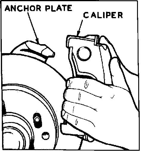 6. Lift caliper from anchor plate and off rotor. Hang caliper from coil spring with wire. Do not allow caliper to hang from brake hose.