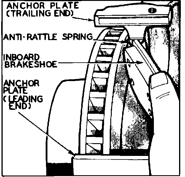 7. Remove inboard brake shoe from anchor plate, then the anti-rattle spring from the brake shoe. Remove teflon slipper plate from leading anchor abutment surface, if equipped.