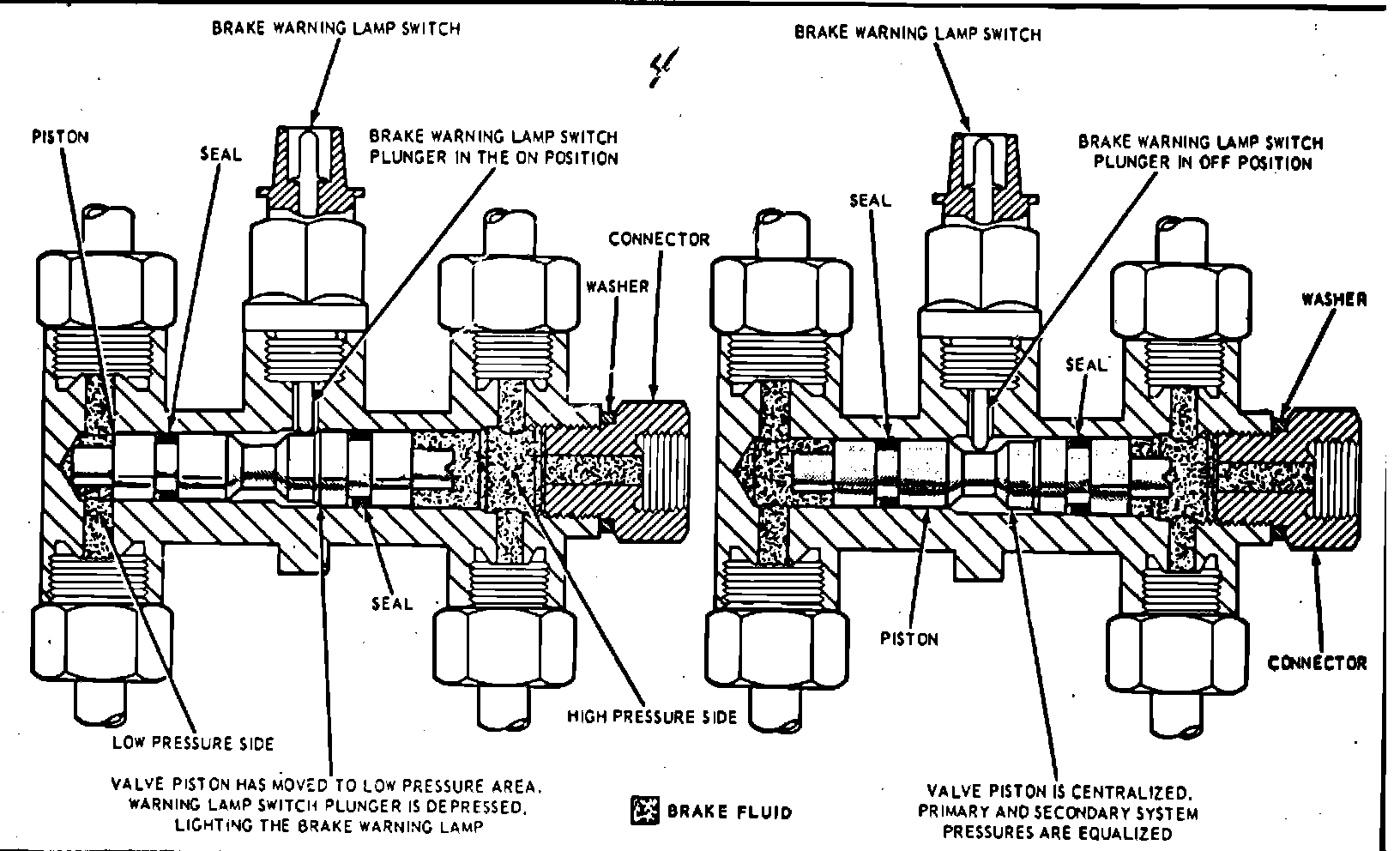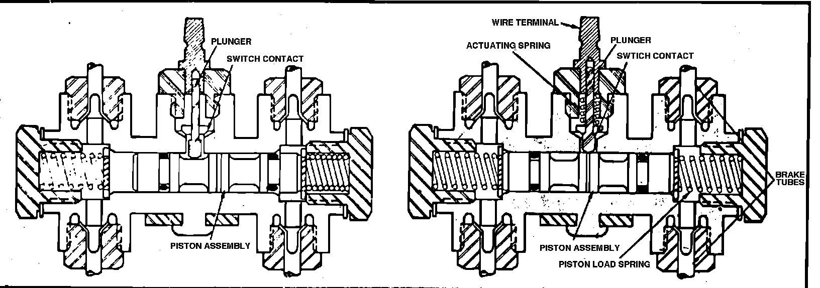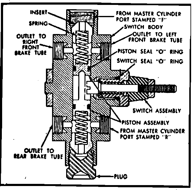 The valve assembly consists of two valves in a common bore that are spring loaded toward the centered position. The spring-loaded switch contact plunger rests on top of the valves in the centered position (right view). When a pressure differential occurs between the front and rear brake systems, the valves will shuttle toward the side with the low pressure. The spring-loaded switch plunger is "triggered" and the ground circuit for the warning light is completed, lighting the lamp (left view).