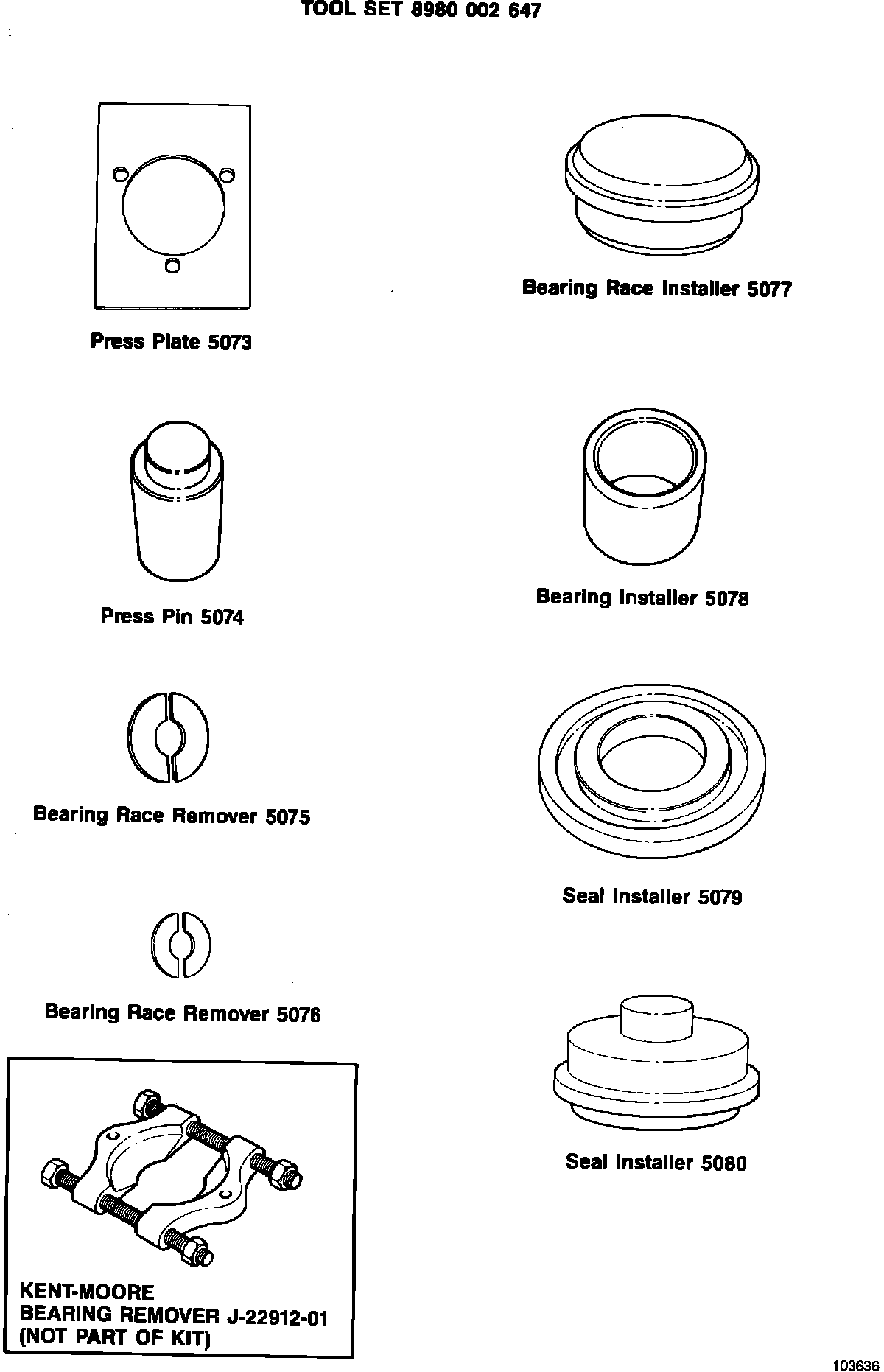 The new tools are designed for use with an arbor or hydraulic press and Kent-Moore bearing remover tool J-22912-01. They must not be used with any impact tools, such as a slide hammer or machinist hammer, to remove or install the bearings (Fig. 1).