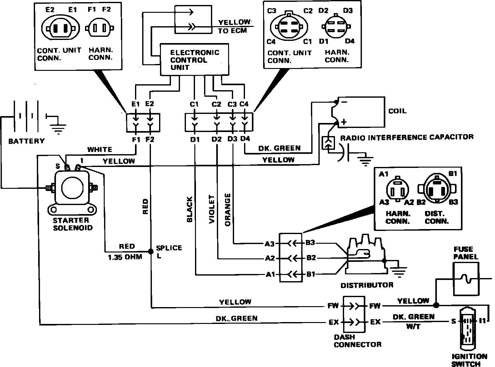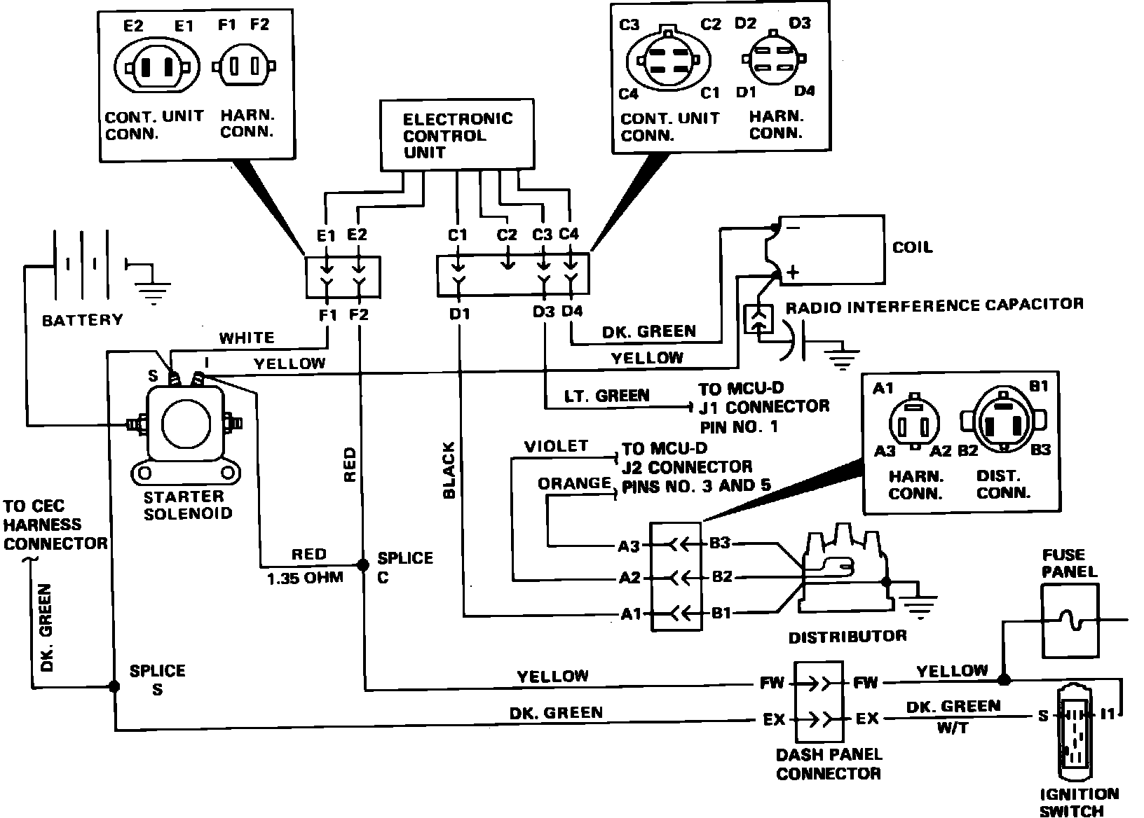 3. Disconnect and connect the three wire connector at distributor and measureresistance between terminals ``D2'' and ``D3'' of the harness connector,Figs. 1 and 2. If resistance is now between 400-800 ohms, proceed toStep 6. If not, disconnect three wire connector at distributor and proceedto next step.