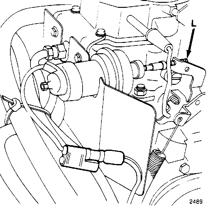 9. With the Sole-Vac throttle positioner fully extended, turn the vacuum actuator adjustment screw (L) on the throttle lever until the specified engine rpm is obtained. Refer to the Vehicle Emission Control Information label.