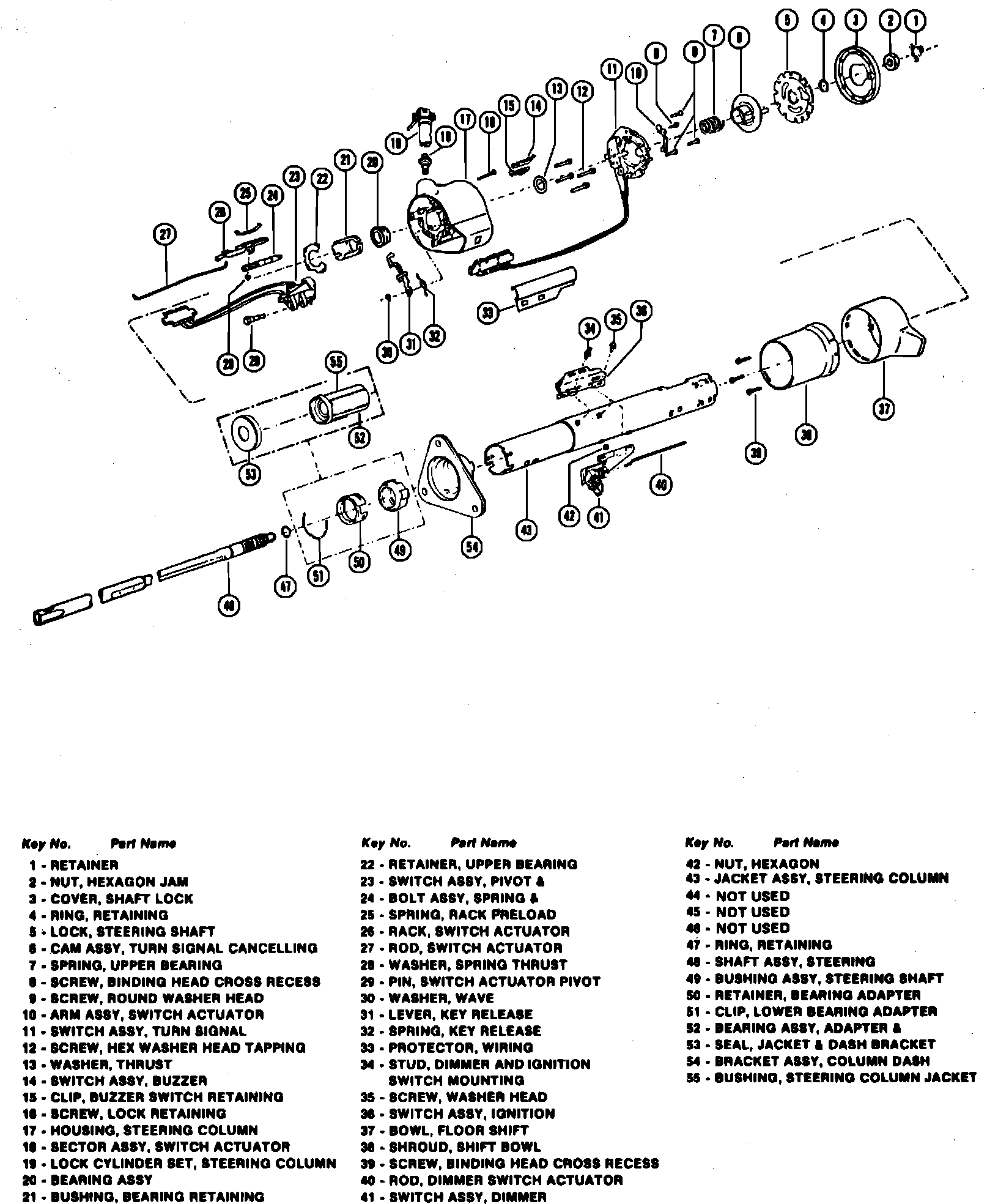 Fig. 26 Fixed key release steering column exploded view. Rear Wheel Drive Models: