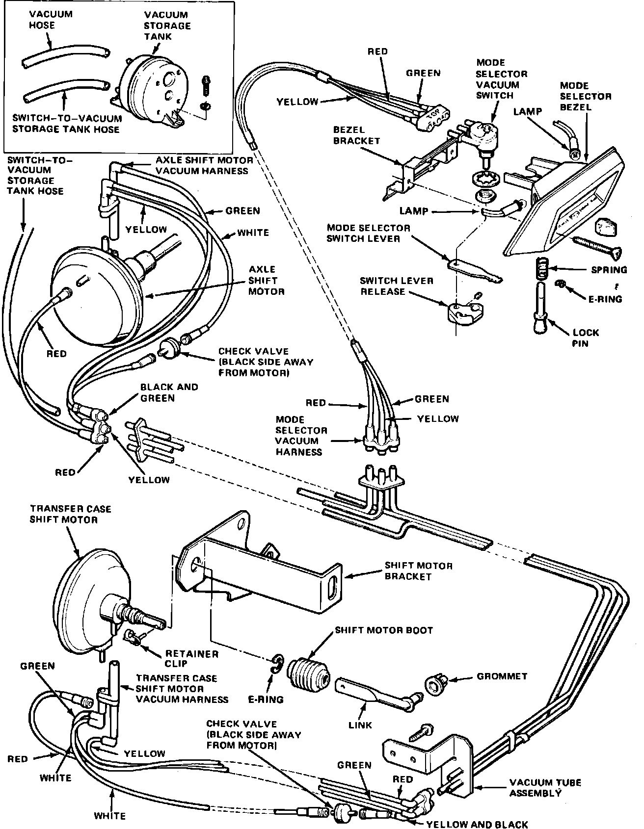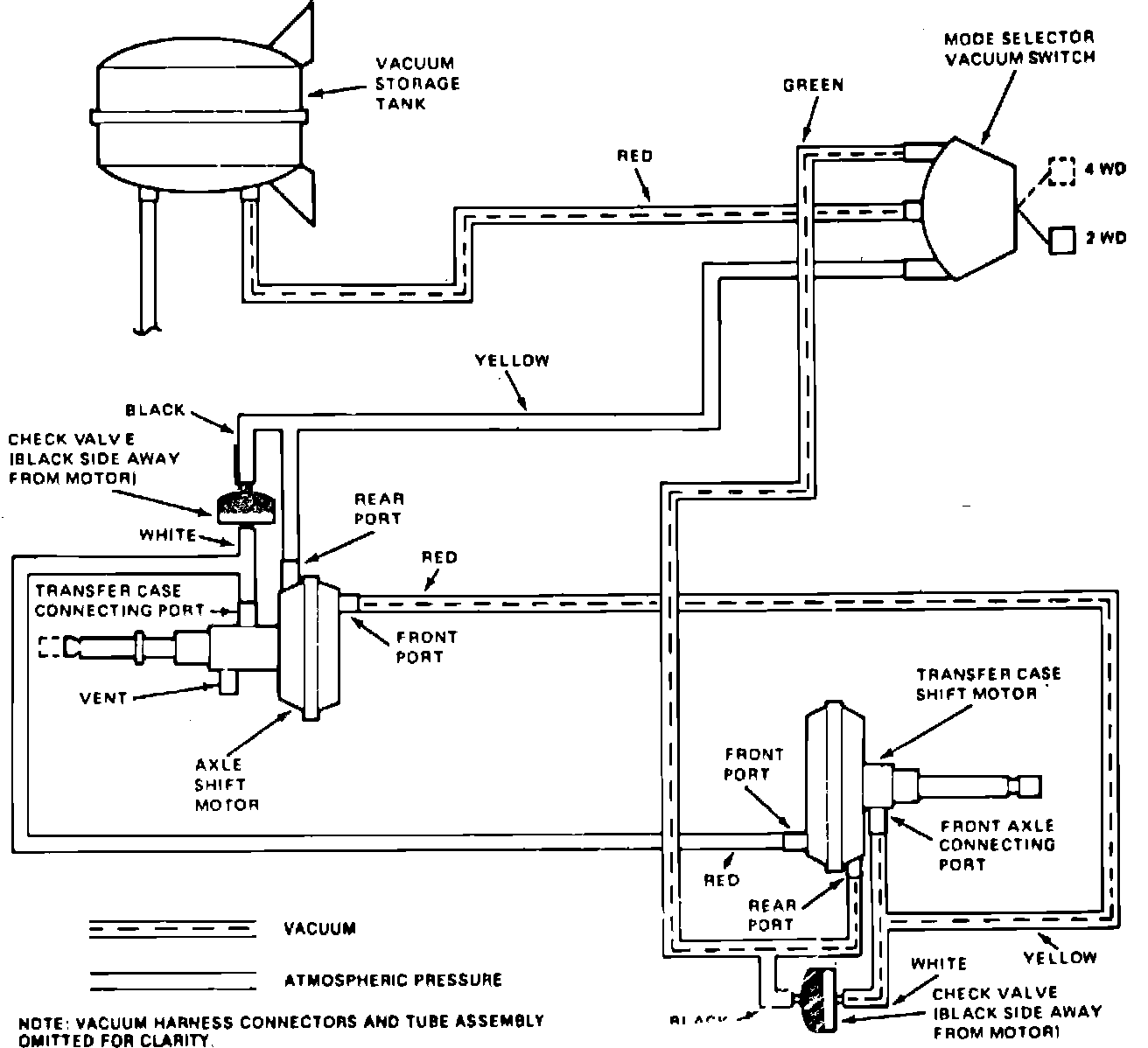 5. Connect a suitable vacuum pump to steel tube that connects to green hose in harness. Apply 20 inches of vacuum and rotate rear propeller shaft to engage transfer case, then shift transmission into park (if automatic) or first gear (if manual). If transfer case does not engage proceed to step 8. If transfer case does engage, refer to next step.