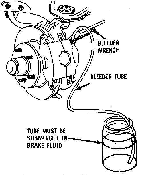 Flushing is performed at each wheel in the same manner as the bleeding operation except that the bleeder valve is opened 1.5 turns and the fluid is forced through the lines and bleeder valve until it emerges clear in color. Approximately one quart of clean brake fluid is required to flush the hydraulic system. After completing the flushing operation at all bleeder valves, check to ensure the master cylinder is filled to the proper level.