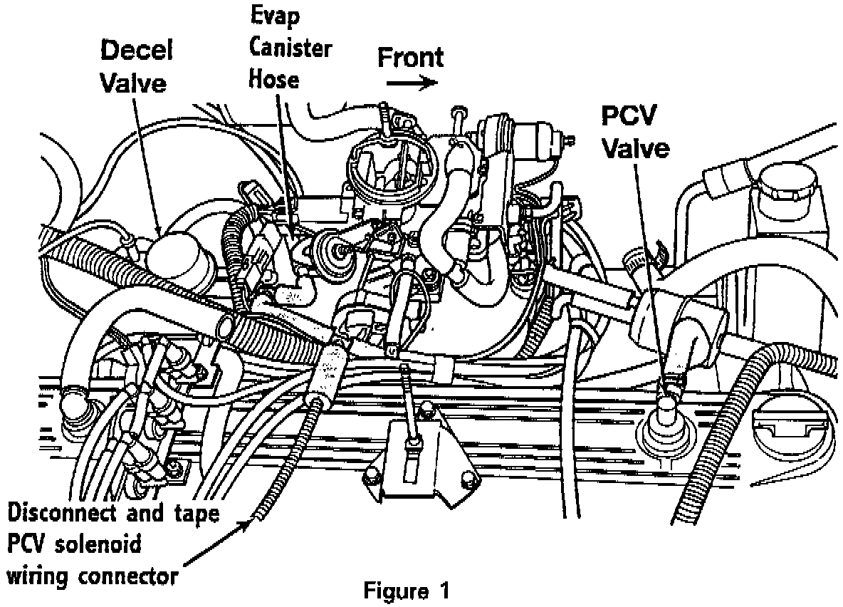3. Disconnect the PCV harness from the carburetor, evaporative canister, and decel valve (manual transmission equipped vehicles only) (Figure 1).