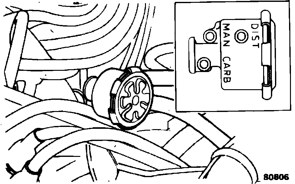 On some models, this valve is added to the air cleaner to control vacuum between the intake manifold source and the spark CTO switch. The purpose of the valve is to allow the flow of controlled manifold vacuum when air passing through the air cleaner is below 55° F for 6 cyl. engines. At temperatures above this level, manifold vacuum is prevented from reaching the spark CTO until coolant temperature reaches the spark CTO switch point.