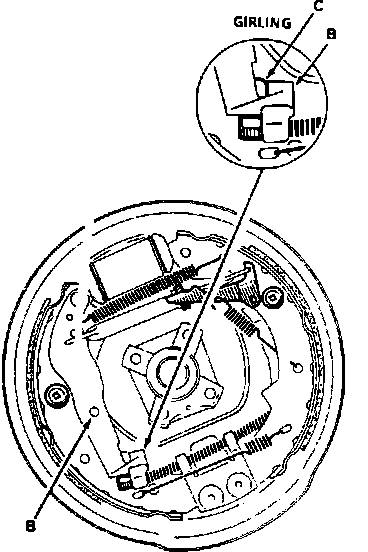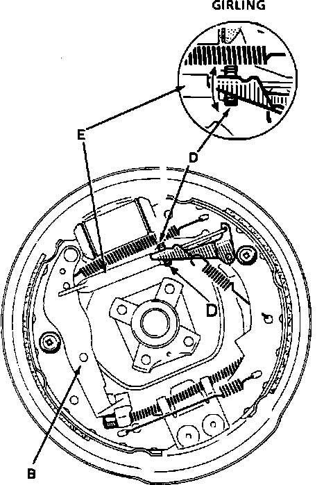 8. With rear brake shoes adjusted to 8.97-9.0 inch, back off star wheel adjuster (D) 5-6 teeth.