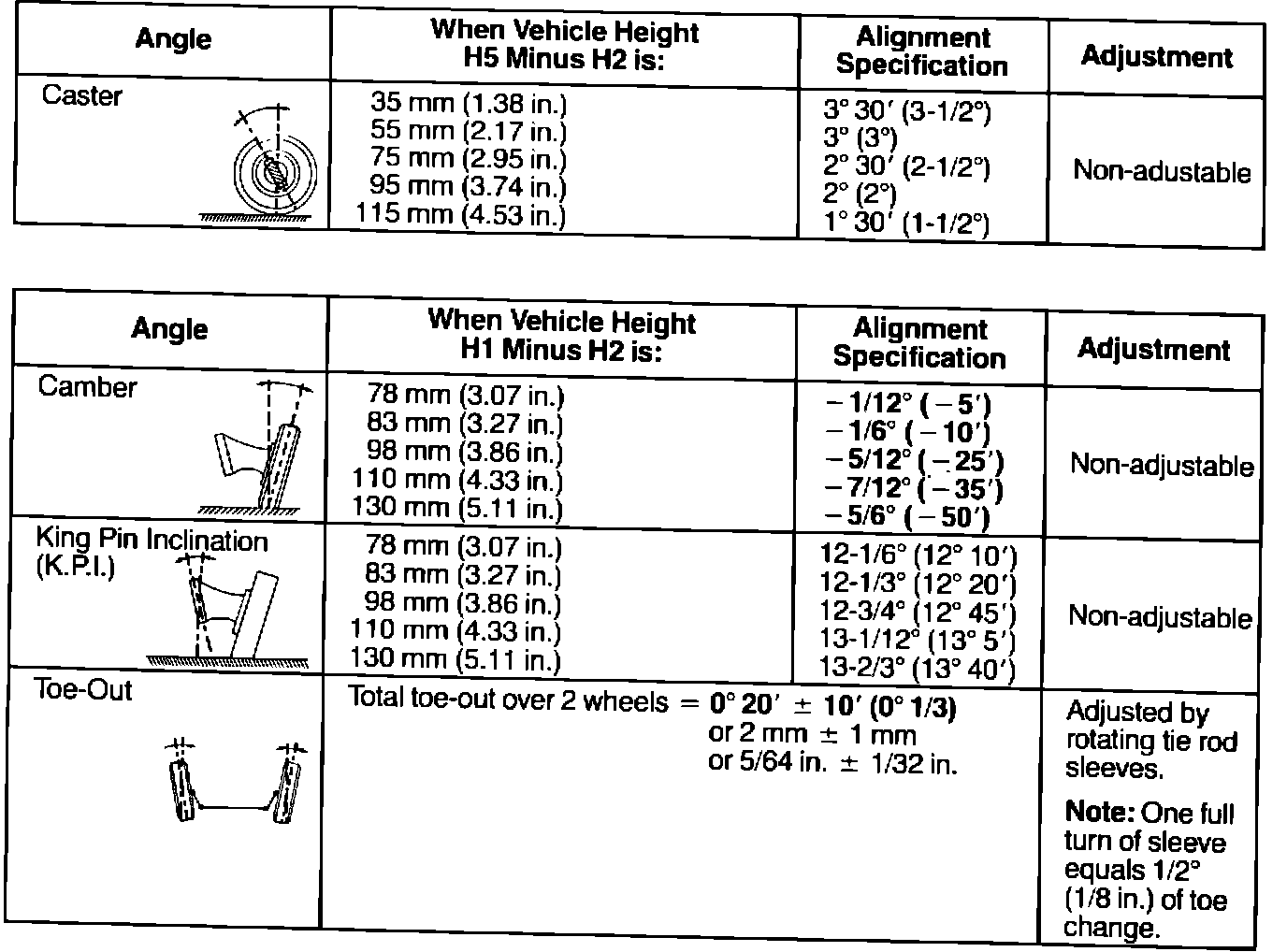 Vehicle weight must be on all four tires before tightening suspension bushing bolts on such components as the control arms and stabilizer bars. In addition, vehicle height must be determined before checking front end alignment. Refer to the height measurement information on pages J-5 and J-6 of this manual. Record the vehicle heights measured and locate the height value closest to the actual alignment specification. The specifications shown for camber and K.P.I. are +/- 1/2~ Side-to-side variation must not exceed 1~ for caster, camber or K.P.I.