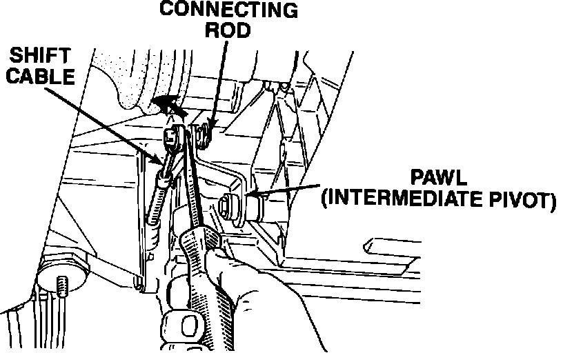 Raise the vehicle. Disconnect the shift lever cable from the pawl (intermediate pivot) ball stud. Disconnect the pawl to transmission connecting rod at the pawl ball stud. (Figure 1.) Rotate the pawl. If the pawl does not rotate freely perform the following repair procedure.